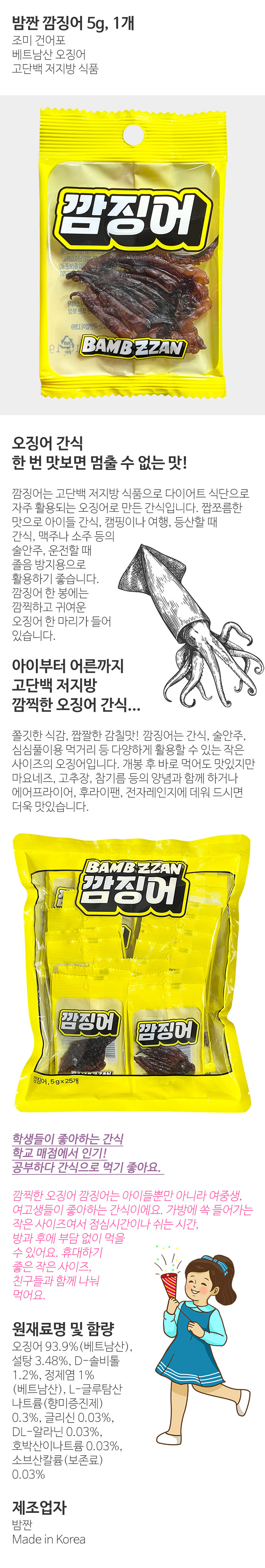 | 원재료명 및 함량 | 오징어 93.9%(베트남산), 설탕 3.48%, D-솔비톨 1.2%, 정제염 1%(베트남산), L-글루탐산나트륨(향미증진제) 0.3%, 글리신 0.03%, DL-알라닌 0.03%, 호박산이나트륨 0.03%, 소브산칼륨(보존료) 0.03% |