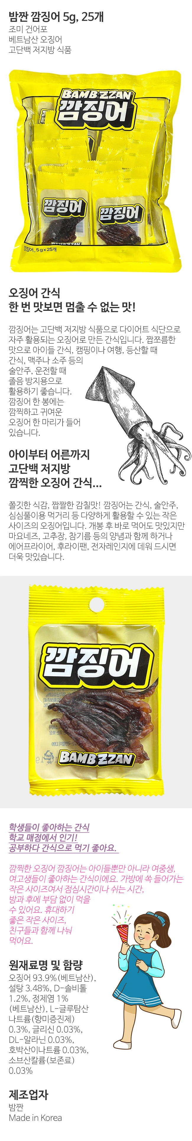 | 원재료명 및 함량 | 오징어 93.9%(베트남산), 설탕 3.48%, D-솔비톨 1.2%, 정제염 1%(베트남산), L-글루탐산나트륨(향미증진제) 0.3%, 글리신 0.03%, DL-알라닌 0.03%, 호박산이나트륨 0.03%, 소브산칼륨(보존료) 0.03% |
