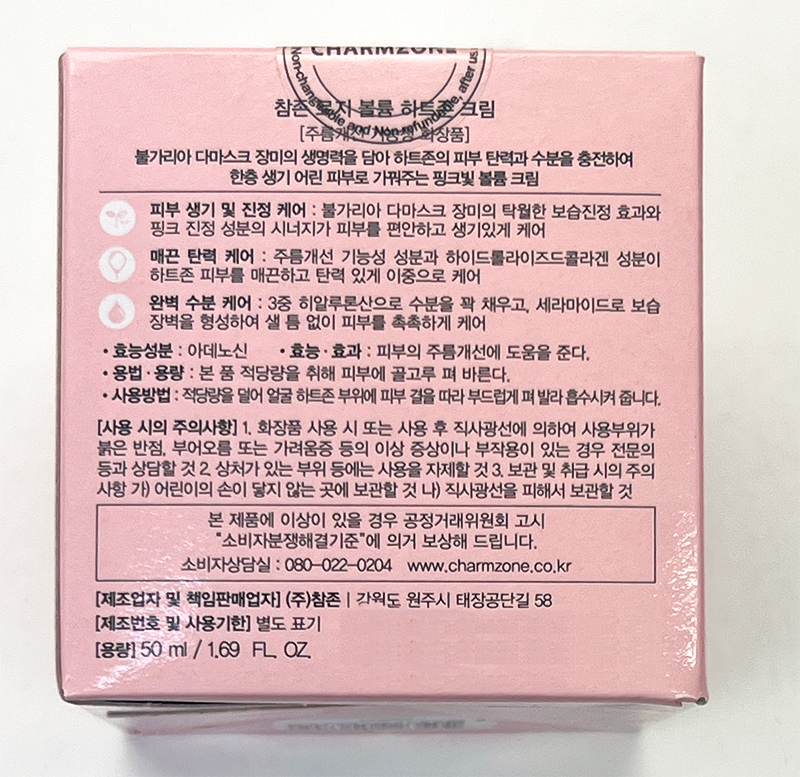 정제수, 글리세린, 메틸프로판다이올, 카프릴릭/카프릭트라이글리세라이드, 글리세릴스테아레이트, 마카다미아씨오일, 베헤닐알코올, 사이클로메티콘, 세테아릴알코올, 스테아릭애씨드, 하이드로제네이티드폴리데센, 다이메티콘, 올리브오일, 칼라민, 피이지-100스테아레이트, 세틸알코올, 다마스크장미꽃수(0.33%), 다마스크장미꽃추출물(0.325%), 효모/다마스크장미꽃추출물발효여과물(0.325%), C15-19알케인, 글리세릴카프릴레이트, 토코페릴아세테이트, 에톡시다이글라이콜, 병풀추출물, 알란토인, 다이메티콘/비닐다이메티콘크로스폴리머, 폴리아크릴레이트-13, 부틸렌글라이콜, 하이드롤라이즈드콜라겐, 해바라기씨오일, 폴리아이소부텐, 다이페닐다이메티콘, 발레이추출물, 잔탄검, 플루란, 1,2-헥산다이올, 아데노신, 하이드로제네이티드레시틴, 소듐글루코네이트, 폴리솔베이트20, 솔비탄아이소스테아레이트, 세리신, 소듐하이알루로네이트, 세라마이드엔피, 토타롤, 하이드롤라이즈드하이알루로닉애씨드, 피토스핑고신, 페녹시에탄올, 향료