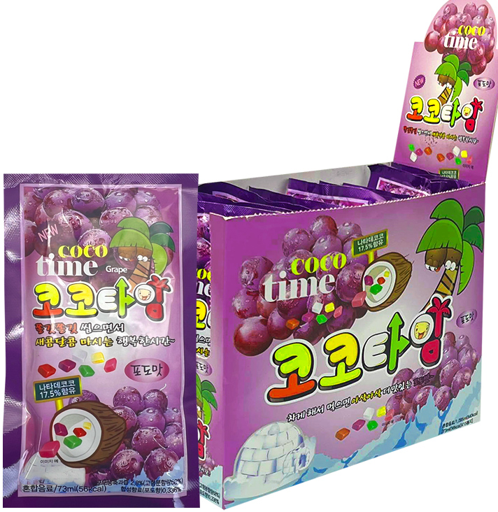정제수, 나타데코코17.5%(코코넛워터, 구연산, 초산), 설탕, 고과당콘시럽, 포도농축과즙2.8%(고형분함량68%), 합성향료(포도향), DL-사과산, 구연산, CMC, 카라기난, 감미료(아스파탐-페닐알라닌 함유), 보존료(안식향산나트륨), 착색료(식용색소적색제40호, 식용색소청색제1호)