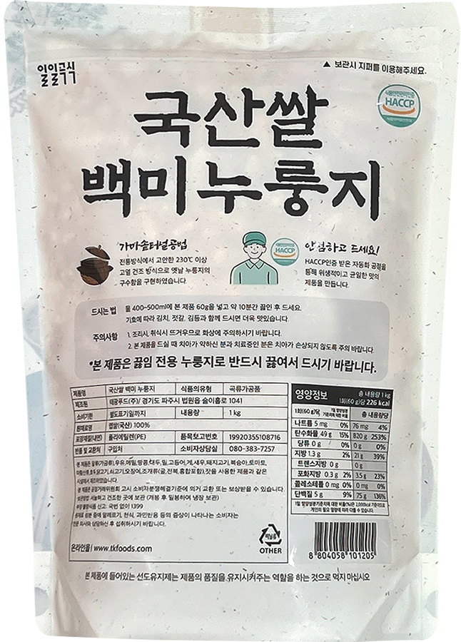 | 제품명 | 일일곡식 국산쌀 백미누룽지 1kg |