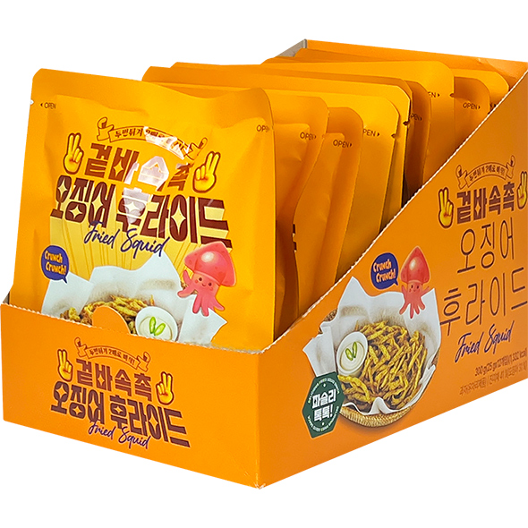 오징어 후라이드 70%[중국산/진미채{오징어75%, D-소비톨, 트레할로스, L-글루탐산나트륨(향미증진제), 덱스트린, 설탕, 정제소금, 변성전분, 구연산, L-알라닌, 합성향료(오징어향), 5-리보뉴클레오티드이나트륨}, 파우더{밀가루, 변성전분, 쌀가루, 설탕, L-글루탐산나트륨(향미증진제), 탄산수소나트륨, 정제소금, 구아검, 오징어분말0.05%,B-카로틴(착색료)}, 정제수, 현미유], 팜올레인유)팜올레인:말레이시아산), 건조파슬리분말(외국산:독일, 이집트, 아스라엘 등), 오징어, 밀 함유 |